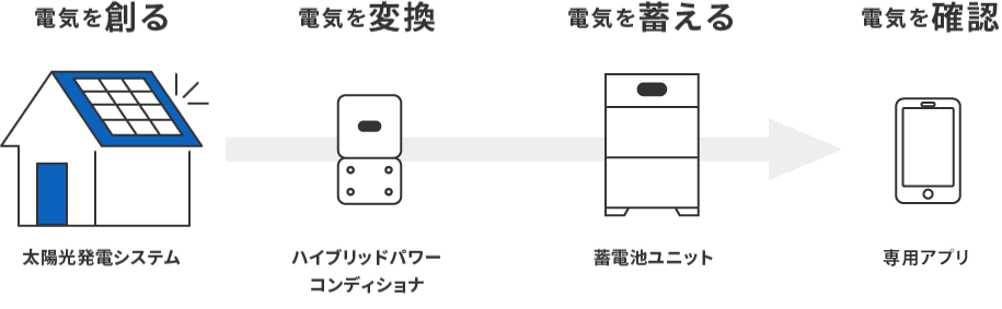 太陽光発電も蓄電池もコントロールできるハイブリッドパワーコンディショナと蓄電池を組み合わせた新しいシステムです。