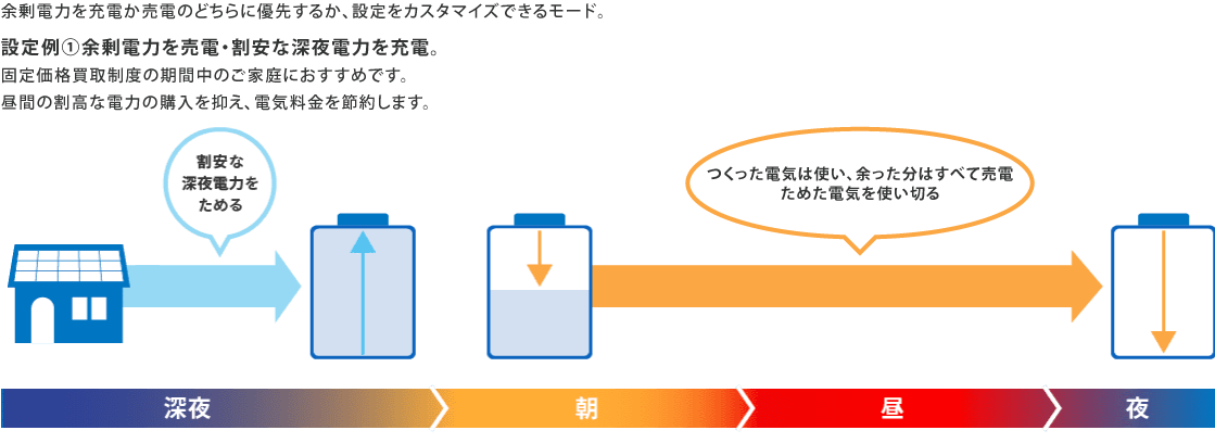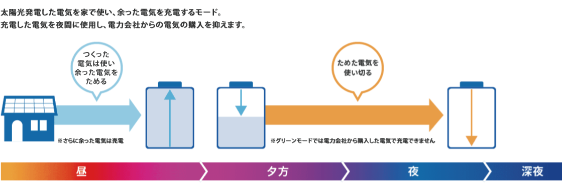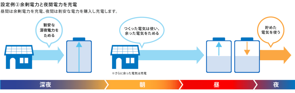 また、太陽光発電システムと連携させている場合は、太陽光で発電した電気を優先して使う設定などもできますので、日中は太陽光で作った電気を使い、夜間は蓄電池で貯めてあった電気を使うなど、更に長く電気をお使い頂くことが可能です。